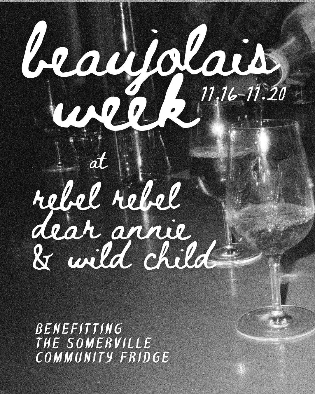 From November 16–20, we’re celebrating Beaujolais in all its forms—from Nouveau to Cru—at Dear Annie, Wild Child, and Rebel Rebel, with each spot bringing their own flavor to the fête.